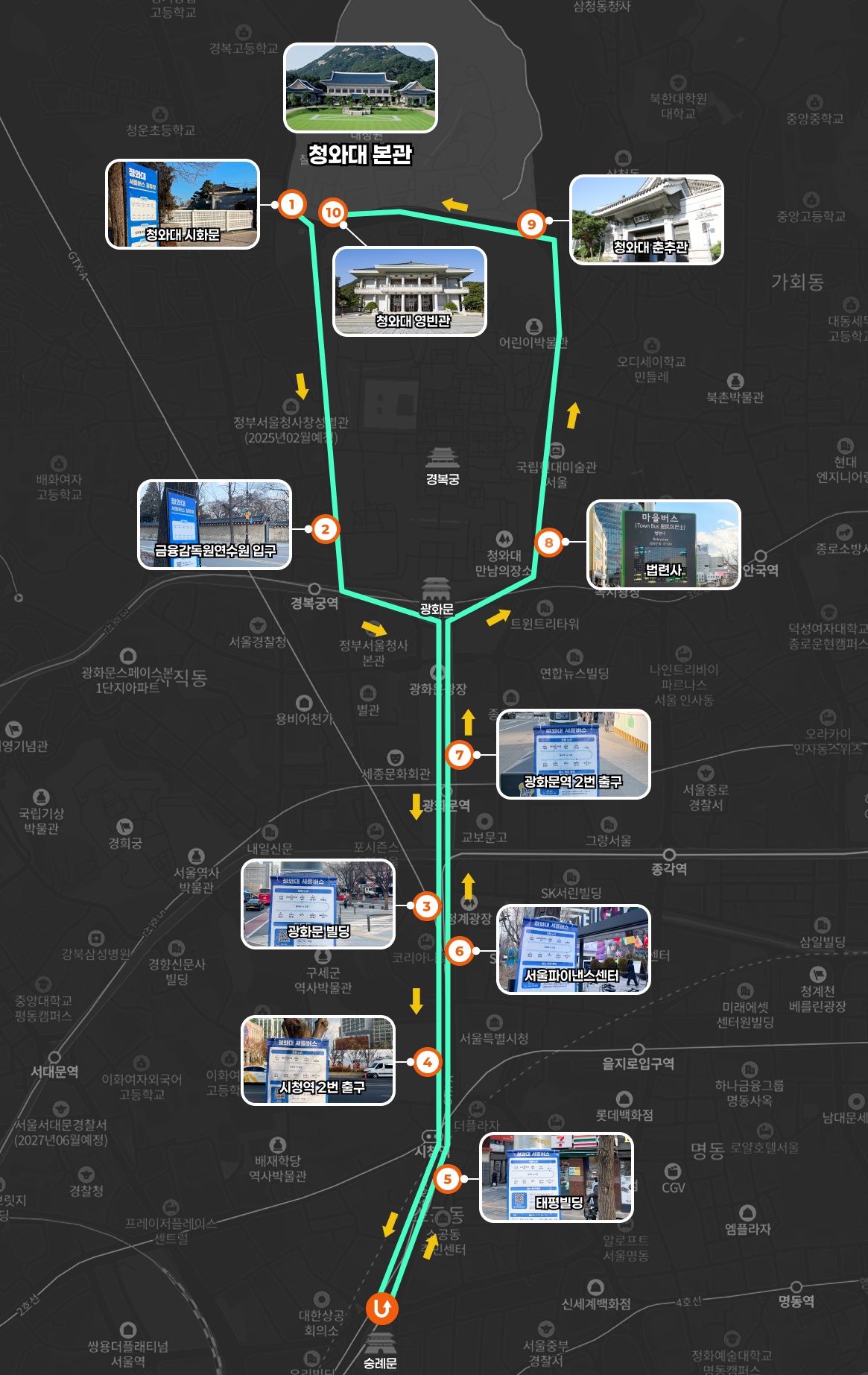 총 10개의 정류소를 순환하며 운행 구간은 청와대 시화문에서 시청역 주변까지 이어집니다.